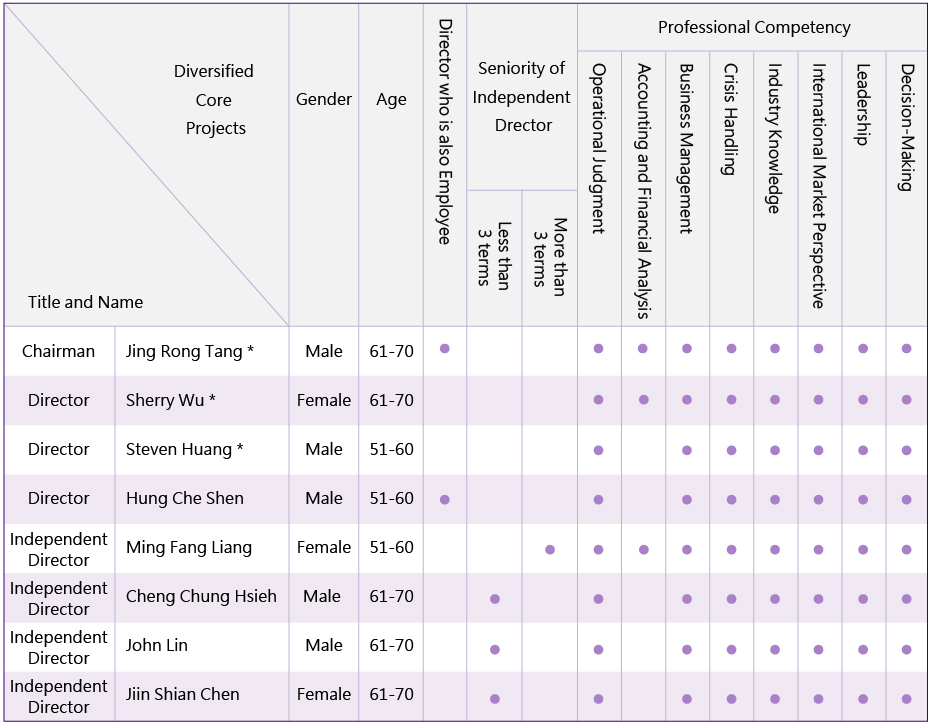 Board Diversity Policy The composition of the board of directors should consider diversity of board composition should be taken into account. In addition to the fact that the number of directors who are also managers of the Company should not exceed one-third of the total number of directors, appropriate diversity guidelines should be formulated with respect to the Company's operation, business model and development needs, which should include but not limited to the following two major criteria : 1. Basic criteria and values: gender, age, nationality and culture, etc. 2. Expertise and skills: Professional background (e.g., law, accounting, industry, finance, marketing, or technology), professional skills, and industry experience. Structure of the Board of Directors 1. The Company’s Board of Directors is composed of 8 members, including 4 independent directors, with outstanding professional backgrounds and comprehensive experience covering the semiconductor industry, finance, business, law and management fields. 2. With respect to the specific management objectives of the diversity policy of the Board of Directors, it is expected to have one or more female director. Currently, the Company has three female directors, representing 37.5% of the Board. Directors who are also employees account for 25%, while independent directors make up 50% of the Board. Among the current board members, five directors are over 60 years old, and three are between the ages of 51 and 60. 3. Implementation of diversity among board members: ![]() * Note : The representative of Uholy Investment Co., Ltd. |